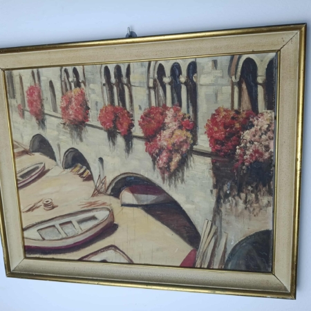 Antico dipinto ad olio su tela vintage barca e ponte e fiori.